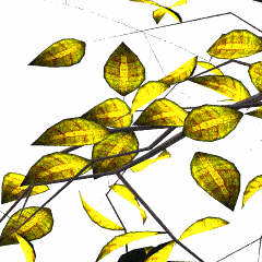 | Original leaves (flat polygons) Xfrog render | Modified leaves (flattened "horns") | Modified leaves backlit POV-Ray render |